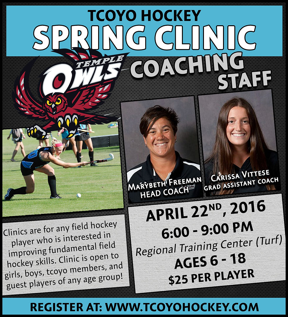 Please join us on Friday as TCOYO Hockey welcomes the Temple coaching staff to host our spring clinic on April 22nd! Head Coach Marybeth Freeman and assistant coach Carissa Vittese will guide athletes through a series of drills and small game play during the 3 hour clinic! The clinic will run from 6:00 - 9:00 pm.