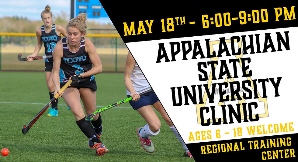Please join us on Friday, May 18th, as TCOYO Hockey welcomes the Appalachian State University coaching staff to host our spring clinic! The App State staff will guide athletes through a series of drills and small game play from 6:00 - 8:00 pm and open game play for those who want to stay from 8:00 - 9:00 pm. Cost is $35 per player. The clinic will take place at the Regional Training Center turf field.